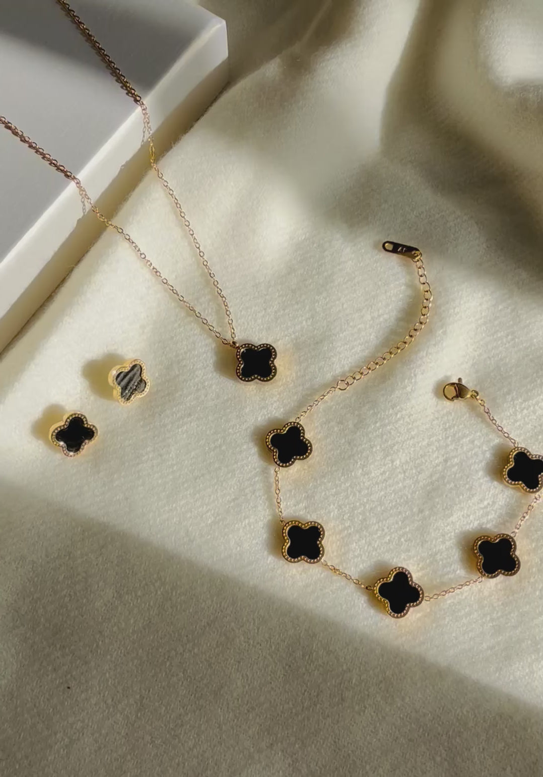 Dieses edle Schmuckset vereint stilvolle Eleganz mit einem Hauch von Glück. Der rote Glücksklee in goldener Fassung symbolisiert Liebe und Harmonie – ein echtes Highlight für jeden Anlass.